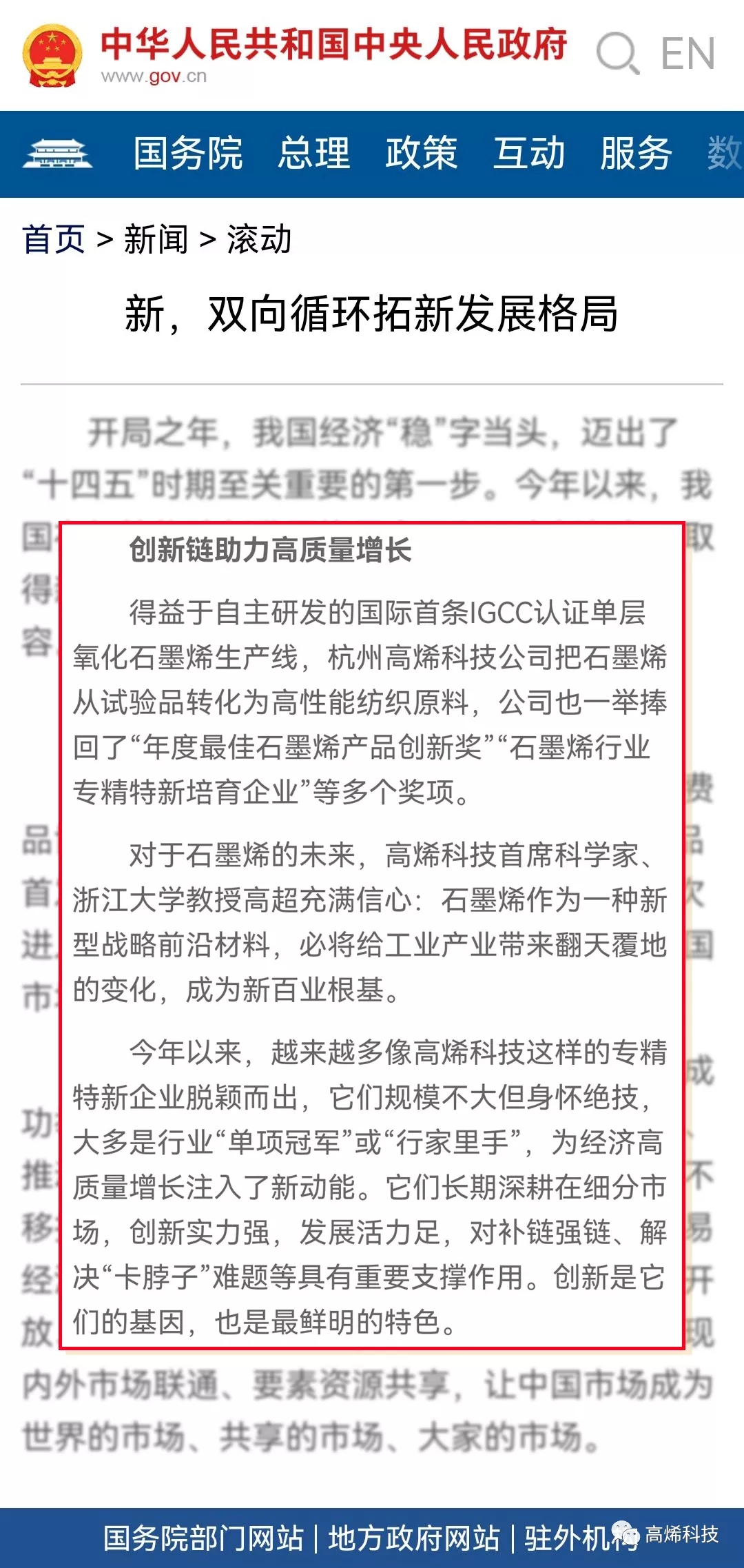 03 高(gāo)烯科(kē)技(jì)的(de)相(xiàng)關報(bào)道(dào)被中央人(rén)民(mín)政府官方網站(zhàn)轉£載