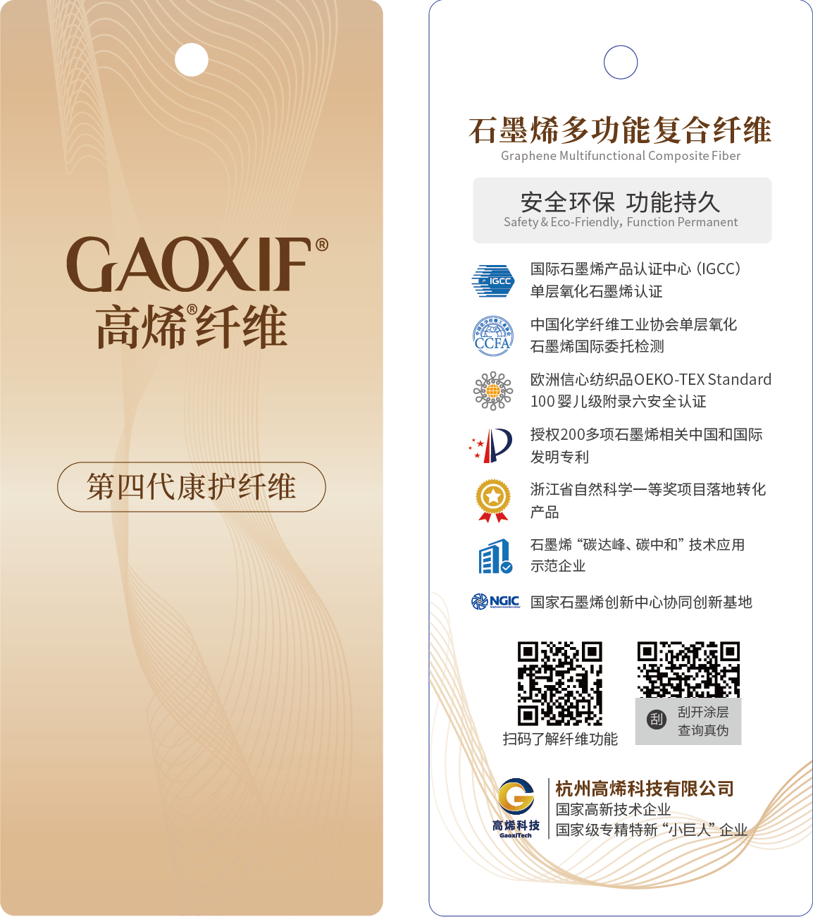 2023-2024年(nián),高(gāo)烯科(kē)技(jì)、東(dōng)明(míng)石墨烯研究院聯合中國(guó)化(huà)學纖維工(gōng)業(yλè)協會(huì)和(hé)北(běi)京服裝學院,共同推動并于第六屆國(guó)際石墨烯日(rì)上'(shàng)發布了(le)中國(guó)石墨烯多(duō)功能(néng)複合纖維标識,推動石墨烯複合纖維的¶(de)市(shì)場(chǎng)逐步走向标準化(huà)、标識化(huà)、吊牌化(huà)及規範化(huà)。