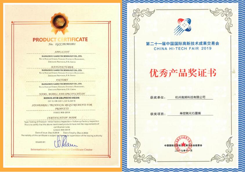 高(gāo)品質原料量産是(shì)石墨烯産業(yè)快(kuài)速發展的(de)關鍵。高(gāo)烯科(kē)技(jì)單層氧化(huà)石墨烯,全套技(jì)術(shù)均為(wβèi)原創,各項指标世界領先。于2019年(nián)獲得(de)國(guó)際石墨烯産品認證中心(IGCC)全球首個(gè↑)單層氧化(huà)石墨烯産品認證證書(shū)、第二十一(yī)屆中國(guó)國(guó)際高(gāo)新技(jì)術(shù)成→果交易會(huì)“優秀産品獎”。