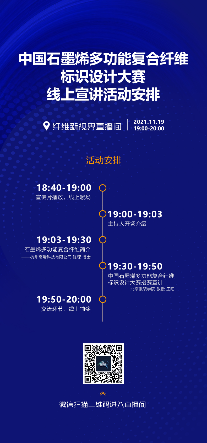 現(xiàn)定于11月(yuè)19日(rì)(星期五)晚19:00-20:00在“纖維新視(shì)界”直播間(jiān)舉辦大(d'à)賽宣講活動。歡迎大(dà)家(jiā)關注。