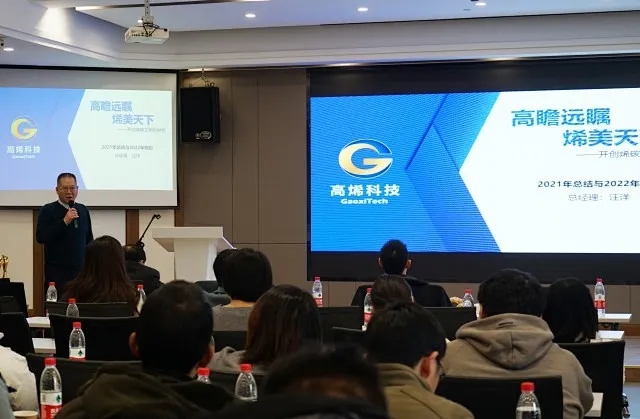 2021年(nián),公司在石墨烯的(de)發展道(dào)路(lù)上(shàng)邁出了(le)新的(de)一(yī)大(dà)步,取得(de)了(le)豐碩>的(de)成果。大(dà)會(huì)上(shàng),高(gāo)超教授進行(xíng)了(le)《烯美(měi)天下(xià)—石墨烯新材料産業(yè)發展之路(lù)》的(de )演講。他(tā)表示,石墨烯是(shì)帶有(yǒu)革新性質的(de)新材料,是(shì)未來(lái)的(de)科(kē)技(jì)基石,有(yǒu)著(zhe)重要(yào)的&(de)戰略前沿意義。這(zhè)一(yī)年(nián),高(gāo)烯科(kē)技(jì)一(yī)直緊随著(zhe)國(gu∏ó)家(jiā)的(de)戰略發展綱要(yào),為(wèi)中國(guó)原創硬科(kē)技(jì★)、浙江省三大(dà)科(kē)創高(gāo)地(dì)等貢獻出了(le)自(zì)己的(de)力量。